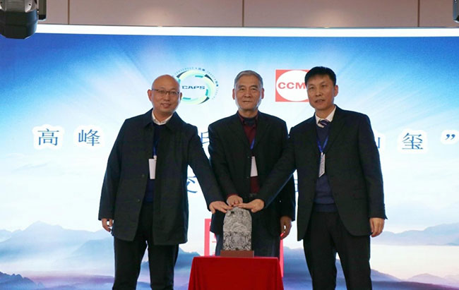中國工程機(jī)械工業(yè)協(xié)會(huì)筑養(yǎng)路機(jī)械分會(huì)會(huì)長焦生杰(中)的見證下,河南亞龍智能裝備有限公司總經(jīng)理張大禹向吉林省公路機(jī)械有限公司總經(jīng)理邵永祥移交峰會(huì)印信“泰山璽”。